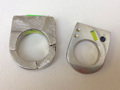 2 sample rings cast in pewter using the delft casting method. These finished rings have acrylic inclusions that were placed into the mould before the metal was poured. The rings show a range of surface treatments, from raw, filed textures to finely polished metal.